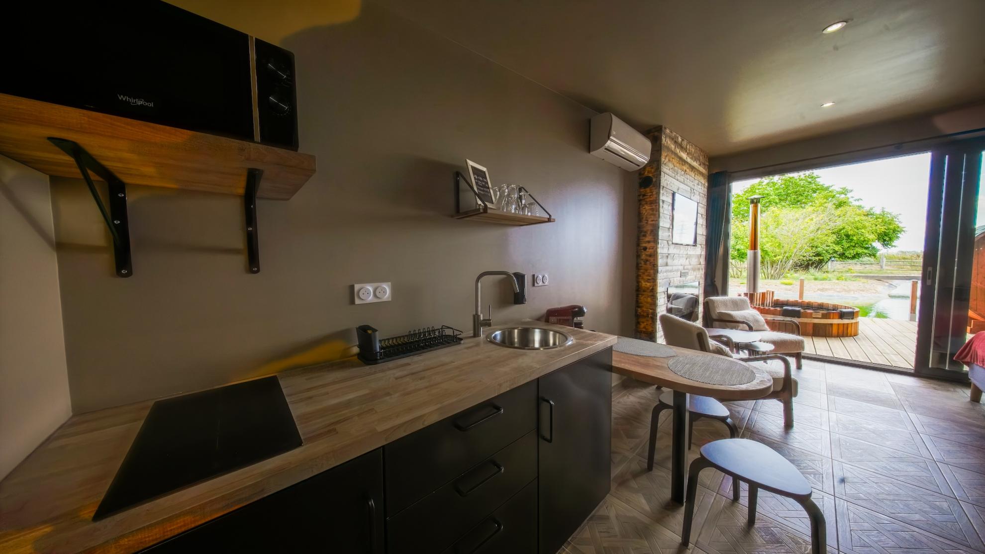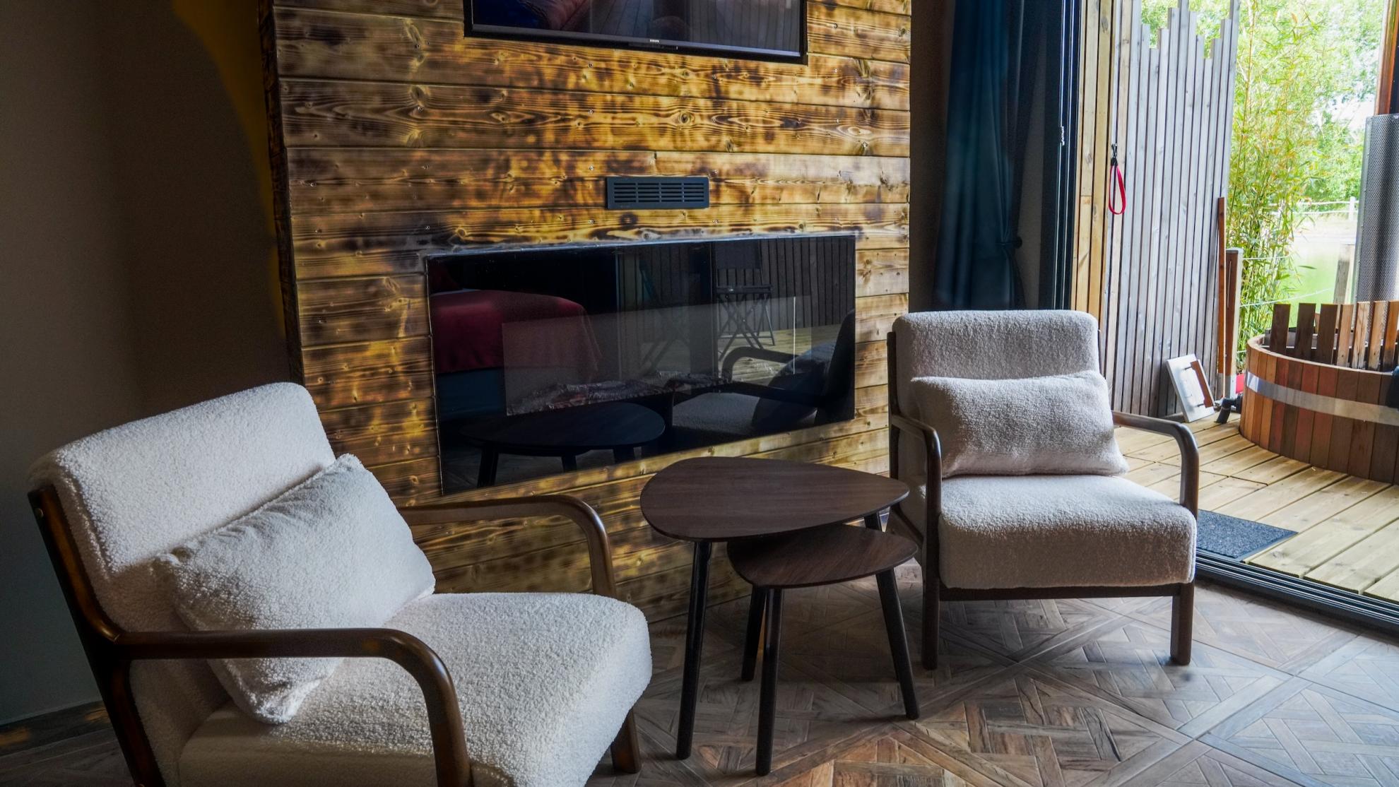 En plus de son bain nordique et de son sauna extérieur, votre lodge l'Authentik est équipé d’une salle de bain avec douche à l’italienne, de WC séparés, d’une kitchenette et d’un coin salon, près de la cheminée.