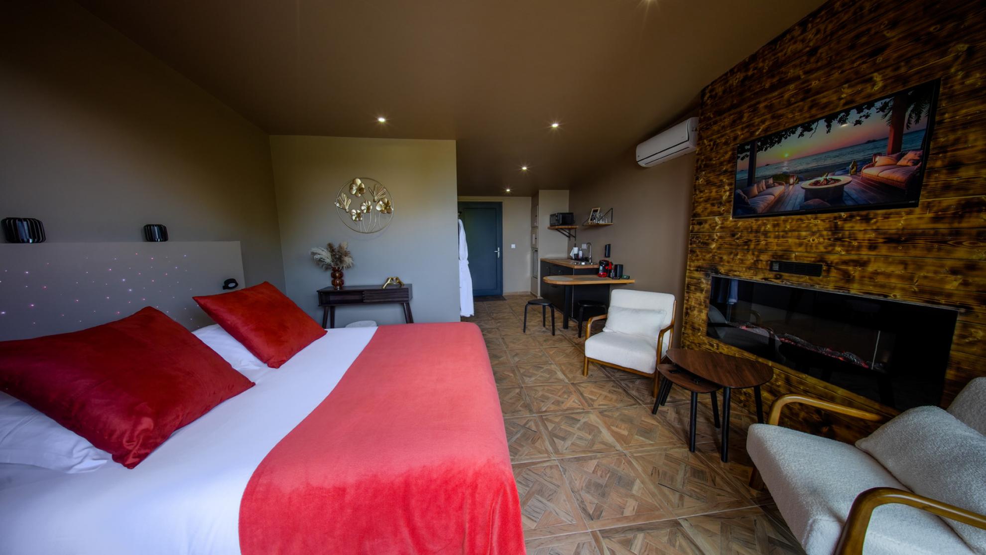 Vous profiterez d’un grand lit deux places et de la large baie vitrée ouvrant sur la terrasse et donnant sur le l’étang. Une machine à café vous permet de profiter à toute heure d’une boisson chaude tandis qu’un mini bar propose un assortiment de softs et de boissons alcoolisées.