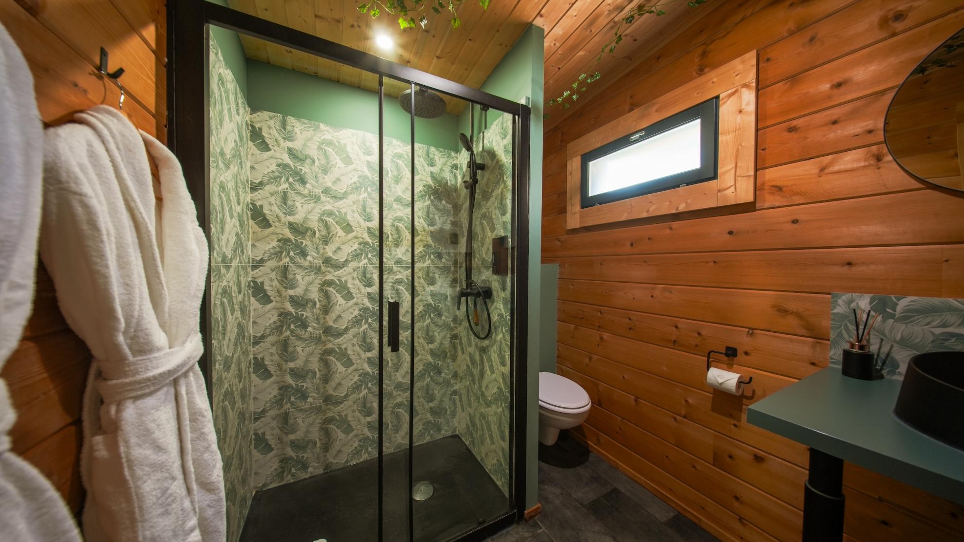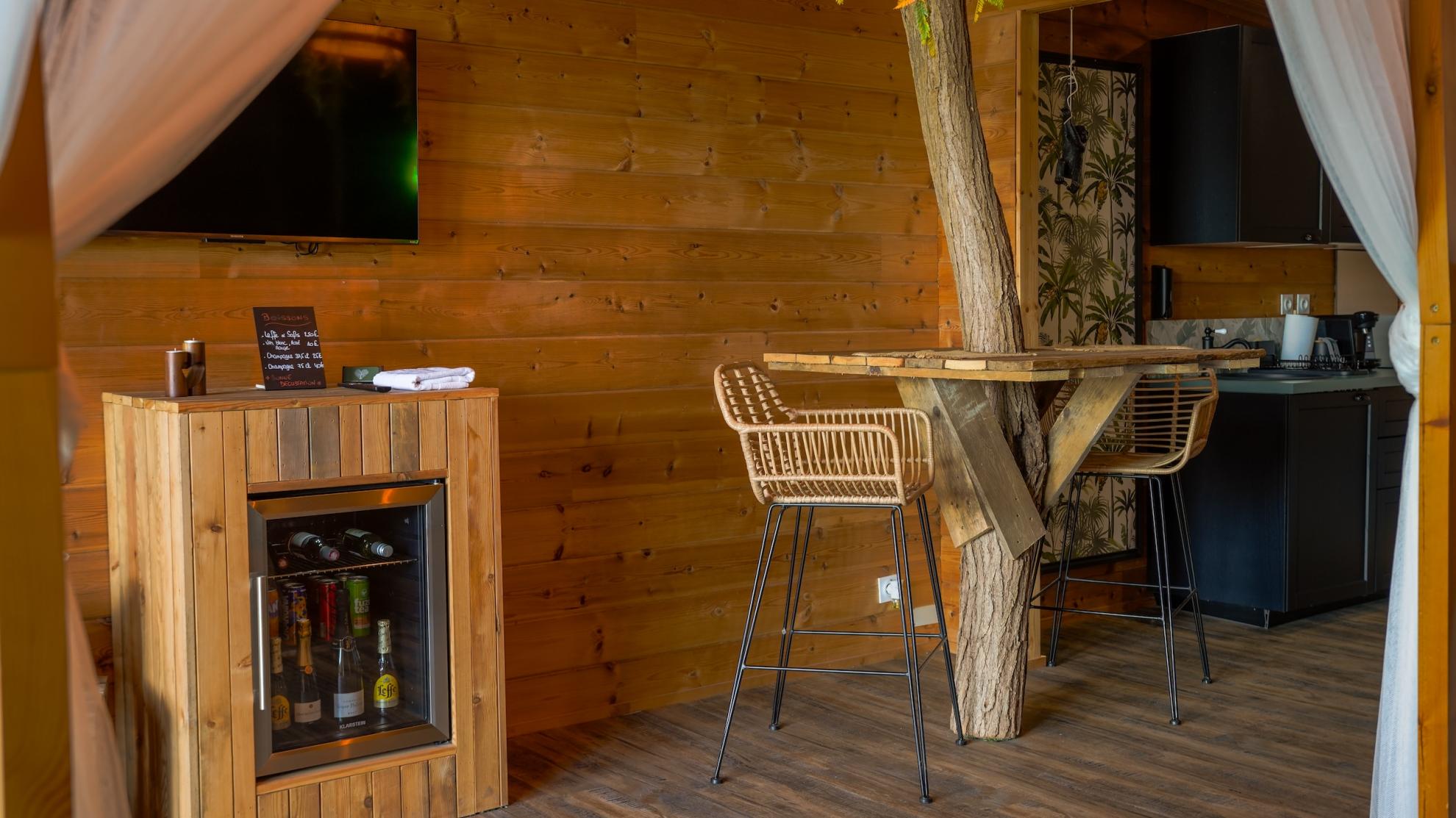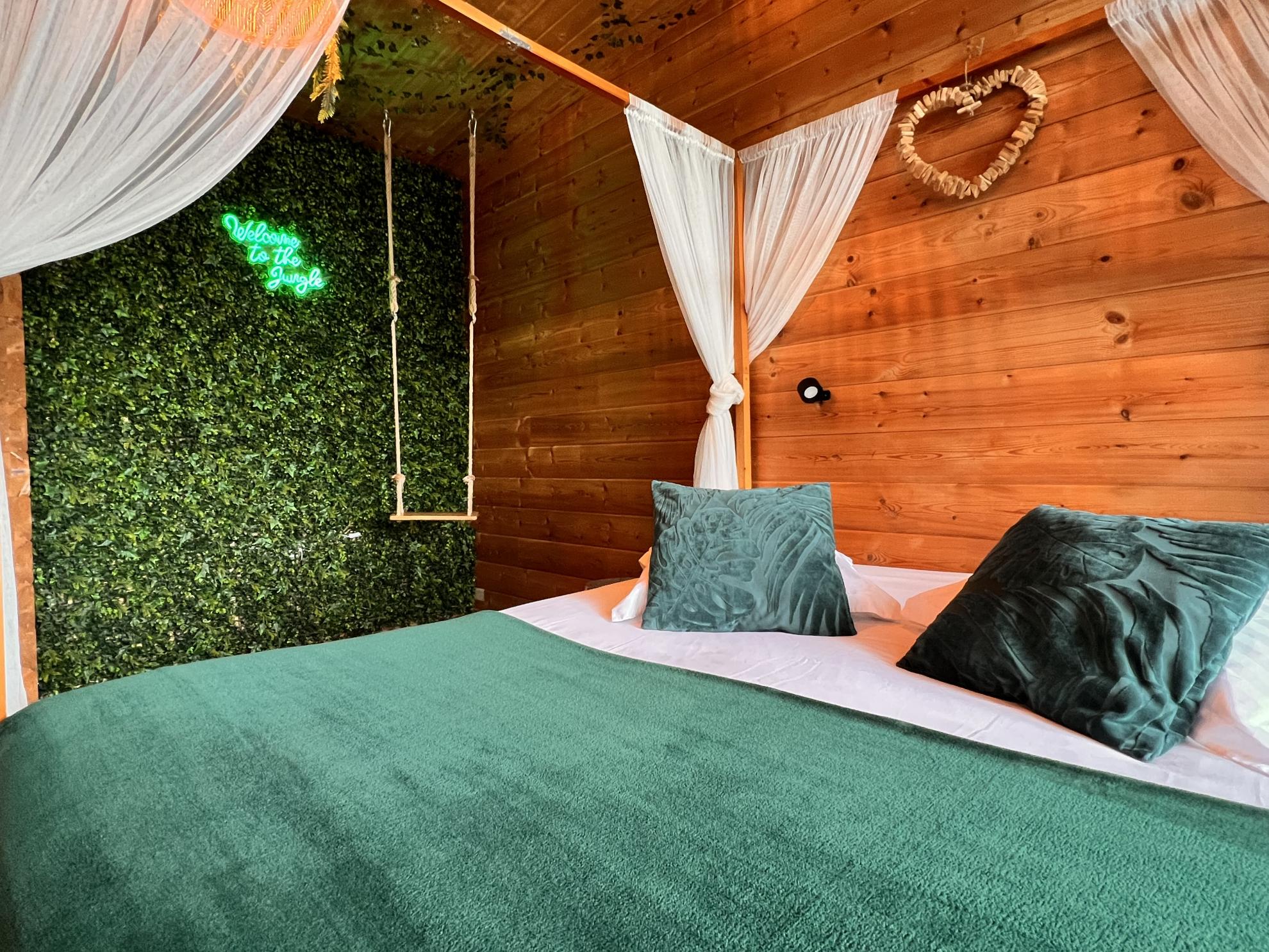 Le Jungle est équipé d’un grand lit double à baldaquin, d'une cuisine entièrement équipée et d’une salle de bain avec douche à l’italienne et WC, d’un mange debout avec deux tabourets confortables.
