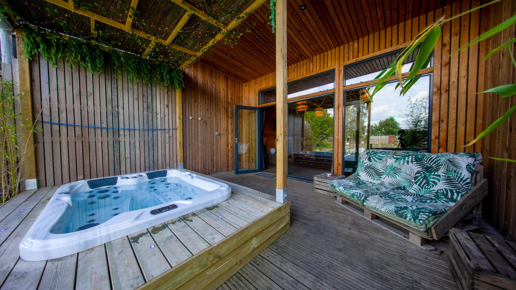 Il est équipé d’un spa extérieur, qui vous permet de vous détendre et de profiter de la vue sur l’étang. Vous apprécierez également le grande terrasse avec coin salon très conforatble